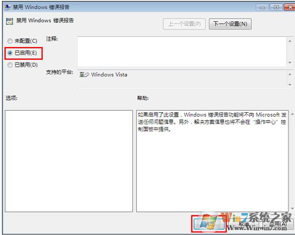 3、最后在彈出的窗口中勾選“已啟用”然后點(diǎn)擊確定就可以了,以后windows就不會(huì)再?gòu)棾鲥e(cuò)誤報(bào)告了,如圖所示: