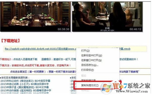 2、然后,回到電影天堂的下載頁面,鼠標指向下載地址,右擊選中復(fù)制快捷方式。