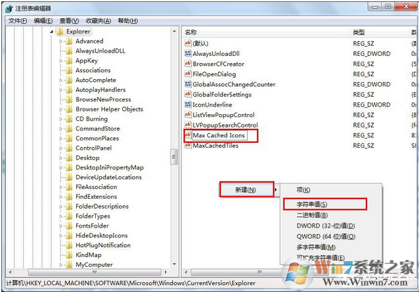 在右邊的展示欄中,找到“Max Cached Icons”,如果沒有,在下方空白處點擊鼠標右鍵”新建”,選擇“字符串值”,創(chuàng)建一個并命名為“Max Cached Icons”,
