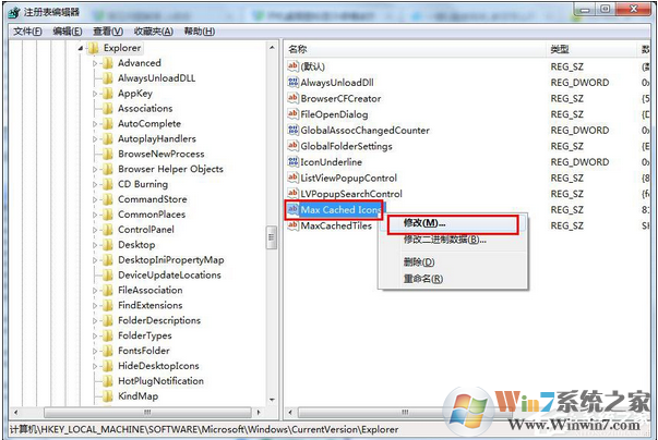 3、選中“Max Cached Icons”項,單擊鼠標右鍵,選擇“修改”選項,打開編輯字符串窗口,如下圖所示:
