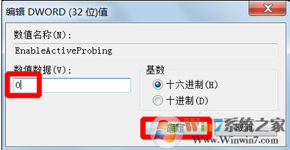 4、雙擊打開其屬性,將其值設置為0,然后點擊確定退出,重啟電腦即可生效。