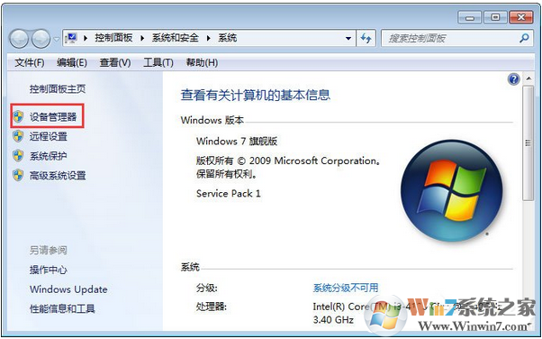 1、在‘計算機(jī)“上單擊右鍵,點(diǎn)擊“屬性”,然后點(diǎn)擊“設(shè)備管理器”;