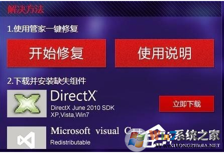 3、頁面往下拉,我們可以看到兩種解決辦法:電腦管家修復(fù)和分別下載兩種丟失了的游戲文件。