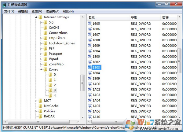 3、右邊窗口找到類型是DWORD值的“1803”鍵值,雙擊打開。