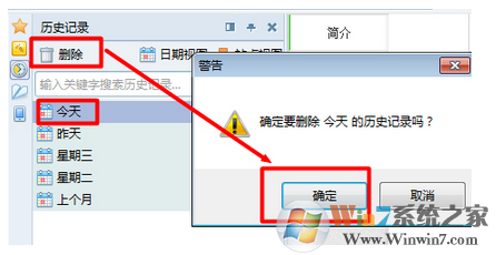 2、在打開(kāi)的“歷史記錄”窗口中,選中要?jiǎng)h除的項(xiàng),點(diǎn)擊“刪除”按鈕即可刪除對(duì)應(yīng)時(shí)間段上網(wǎng)記錄。利用同樣的方法刪除其它時(shí)間段上網(wǎng)記錄。