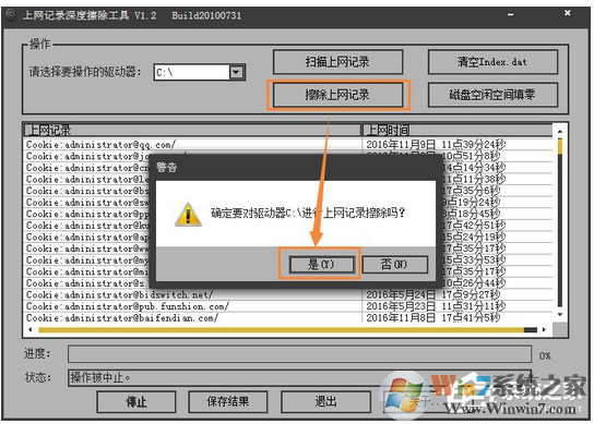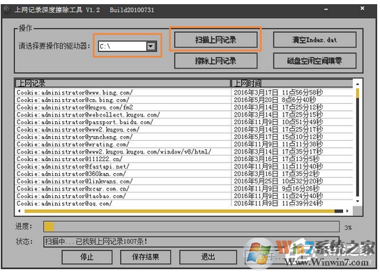 6、待掃描完成后,直接點(diǎn)擊“擦除上網(wǎng)記錄”按鈕,就會(huì)徹底刪除當(dāng)前磁盤(pán)所有的上網(wǎng)記錄。
