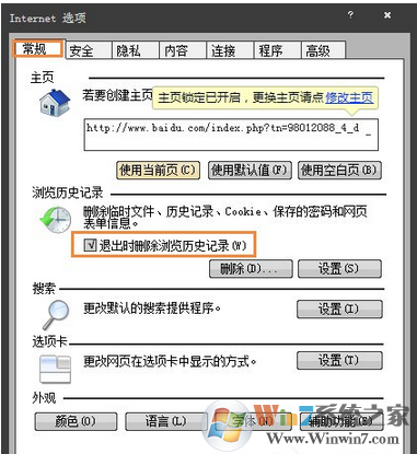 8、在打開(kāi)的“Internet選項(xiàng)”窗口中,切換至“常規(guī)”選項(xiàng)卡,勾選“退出時(shí)刪除瀏覽歷史記錄”項(xiàng)。