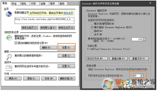 9、點(diǎn)擊“瀏覽歷史記錄 設(shè)置”按鈕,并在彈出的窗口中將“網(wǎng)頁(yè)保存在歷史記錄中的天數(shù)”設(shè)置為“0”,點(diǎn)擊“確定”完成設(shè)置。