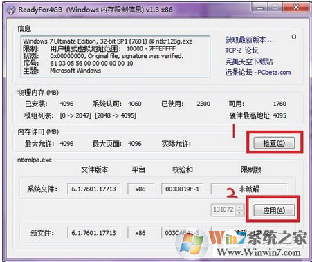 1、首先打開ReadyFor4GB.exe,點(diǎn)擊“檢查”和“應(yīng)用”。