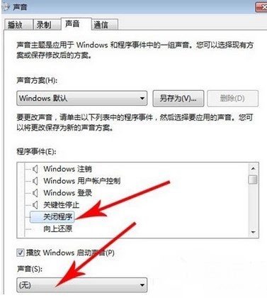 1、點(diǎn)擊“開(kāi)始——控制面板——硬件和聲音——聲音——程序事件里面的關(guān)閉程序”,在下方修改,聲音為無(wú),點(diǎn)擊確定。