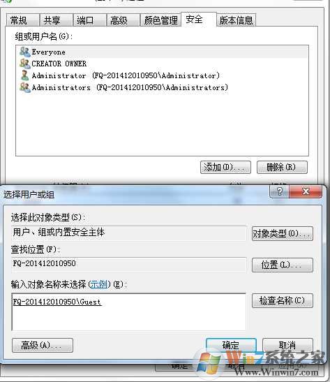 查看一下連接打印機(jī)的電腦的打印機(jī)設(shè)置里面,在安全選項(xiàng)卡下,把GUEST 添加到可訪問列表里面Winwin7.com