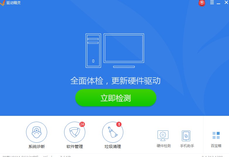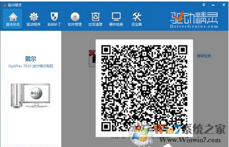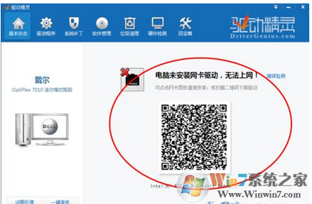 3、軟件安裝完成后打開該軟件,軟件運(yùn)行后會(huì)自動(dòng)檢測硬件驅(qū)動(dòng)的基本狀態(tài),如果電腦中沒有安裝網(wǎng)上驅(qū)動(dòng),軟件將會(huì)彈出如下所示的頁面。在下圖中會(huì)有和本電腦網(wǎng)卡驅(qū)動(dòng)配套的二維碼圖標(biāo)。