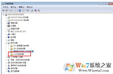 1、首先確定電腦中沒有安裝匹配的網(wǎng)卡驅(qū)動(dòng),打開設(shè)備管理器,找到下圖中紅色方框內(nèi)的選項(xiàng),即“以太網(wǎng)控制器”。如果些項(xiàng)出現(xiàn)下圖所示的黃色標(biāo)志則可以確定是網(wǎng)上沒有安裝成功導(dǎo)致電腦不能正常上網(wǎng)的。