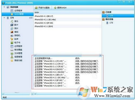 4、下方的信息列表會提示當(dāng)前SHSH的備份情況。每當(dāng)更新一個新版本固件,對應(yīng)老版本的SHSH就無法備份了,所以會提示:“失敗,您行動的太晚了。”