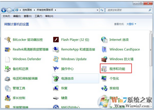 3.切換成大圖標(biāo),然后在控制面板中 找到程序和功能,點(diǎn)擊。
