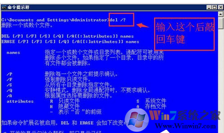 在彈出的黑色運行窗口里面輸入圖的:del /? ---》然后敲回車按鍵。