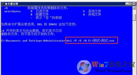 2、根據(jù)幫助信息得到命令使用方法便是:del [參數(shù)] [路徑文件夾或目的文件]