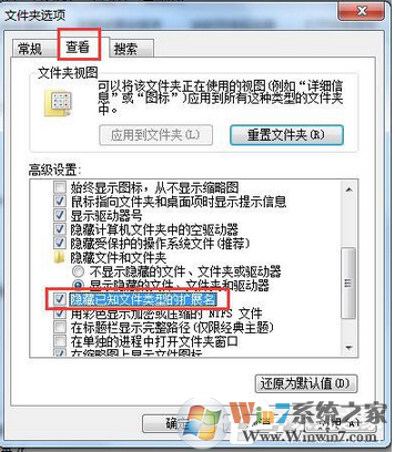 2、點(diǎn)擊進(jìn)入”文件夾選項(xiàng)“里面,找到查看----“隱藏已知文件類型的擴(kuò)展名”如下圖,把前面勾去掉