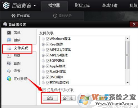 當(dāng)然以上介紹的方法是某個(gè)后綴名的,假如某一類的后綴名文件都是同一個(gè)軟件那不是要關(guān)聯(lián)很多次?比如視頻,音頻文件。我們可以通過直接設(shè)置軟件的文件關(guān)聯(lián),把需要關(guān)聯(lián)的文件一次關(guān)聯(lián)即可。