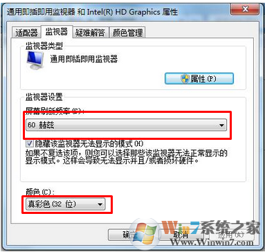 2、在彈出的對話框中選擇【監(jiān)視器】選項卡, 然后在【顏色】下拉列表中選擇合適【真彩色(32位)】選項,單擊【確定】按鈕。(如果不能選擇32位顏色,請檢查分辨率是否已設(shè)為可能的最高值,然后再重新設(shè)置即可。)