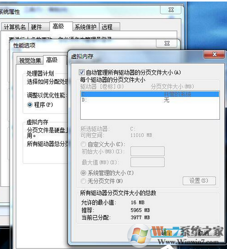 1、計(jì)算機(jī)-屬性-高級(jí)系統(tǒng)設(shè)置-性能設(shè)置-“高級(jí)”選項(xiàng)卡-虛擬內(nèi)存-更改-選擇要設(shè)置的驅(qū)動(dòng)器c盤(pán),選擇系統(tǒng)管理大小或者根據(jù)需要選擇自定義大小-設(shè)置-確定。這最好的方法當(dāng)然是建議增加物理內(nèi)存。