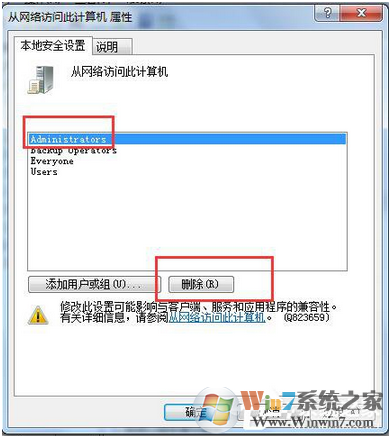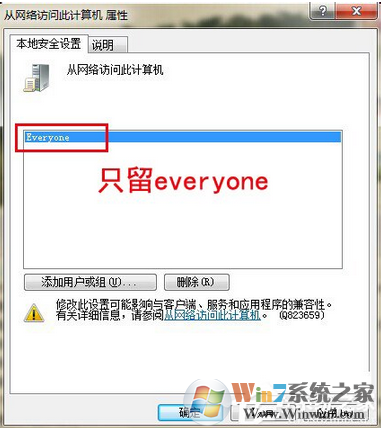 6、彈出“從網(wǎng)絡(luò)訪問(wèn)此計(jì)算機(jī) 屬性”對(duì)話框,在“本地安全設(shè)置”中,在窗格中,將除了“Everyone”以外的其他賬戶都刪除。