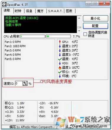 7、下面我們就可以手動調(diào)整風(fēng)扇轉(zhuǎn)速「速度02」,然后發(fā)現(xiàn)Fan2轉(zhuǎn)速變化非常明顯。由于我們是對CPU風(fēng)扇Fan2進行調(diào)速,所以其它的Fan x數(shù)據(jù)不用顯示。