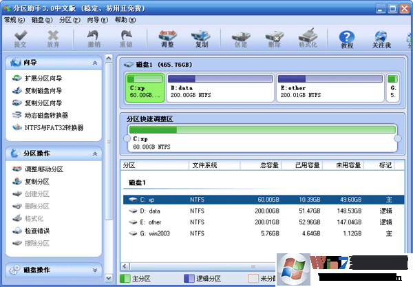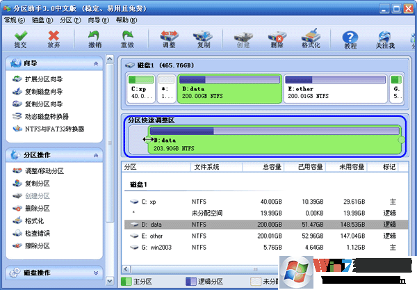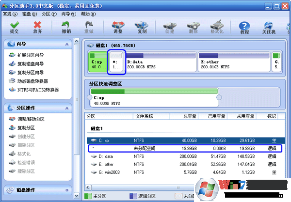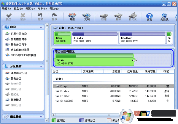 2、這步的目標(biāo)是縮小C盤,請選中C盤并移動鼠標(biāo)到“分區(qū)快速調(diào)整區(qū)”的最右端,然后當(dāng)鼠標(biāo)指針變成雙向箭頭時,點擊圓形的手柄并向左拖動鼠標(biāo)來縮小這個分區(qū)到40GB,如下圖2所示:(您也可以右擊C盤選擇“調(diào)整/移動分區(qū)”選項來縮小C分區(qū)) winwin7.com