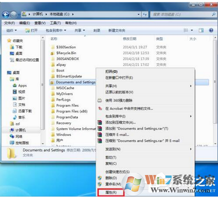 1、左鍵點(diǎn)擊Documents and Settings文件夾,選中,然后點(diǎn)擊右鍵,選擇屬性,