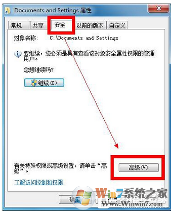 2、在Documents and Settings文件夾屬性頁(yè)面點(diǎn)擊安全選項(xiàng)卡下面的高級(jí)按鈕!