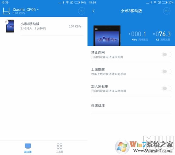 7、登陸成功后就能進入到APP管理界面了,可以查看設(shè)備型號信息和網(wǎng)速等等,并且支持禁止聯(lián)網(wǎng)、上線提醒、加入黑名單、修改備注等設(shè)置,接下來就要進入今天的主題了,開啟好友wifi免密碼設(shè)置,首先需要打開路由器APP的工具箱。▼