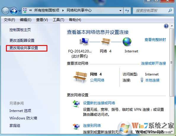 2、然后點(diǎn)擊左邊的“更改高級(jí)共享設(shè)置”選項(xiàng);如下圖所示: