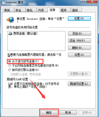 2、打開Internet選項后,我們點擊“連接”切換到連接設(shè)置界面,然后選擇“從不進行撥號連接”選項,然后確定,如下圖;