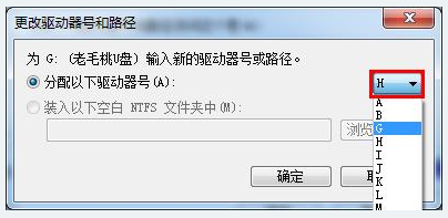 4、接下來在驅(qū)動(dòng)器號(hào)下拉列表中重新分配一個(gè)盤符,然后點(diǎn)擊“確定”,如下圖所示: