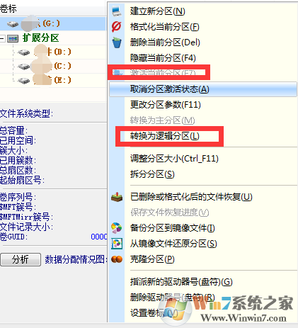 上圖是傳統(tǒng)分區(qū)模式,包含主分區(qū)和擴展分區(qū),如果不是這種類型,就表示我們的分區(qū)有錯誤,就需要更改分區(qū)模式。更改方法通過右鍵方式更換,始終記得一點,傳統(tǒng)引導必須是一個主分區(qū),同時主分區(qū)激活,其他為羅輯分區(qū)。