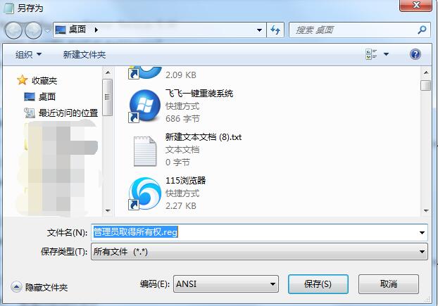 3、點記事本菜單——文件——另存為——選擇“所有文件”然后命名為【管理員取得所有權(quán).reg】;