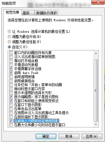 2、選擇自定義,按照小編的勾選方法勾選,對(duì)美觀沒(méi)影響,有能提升性能