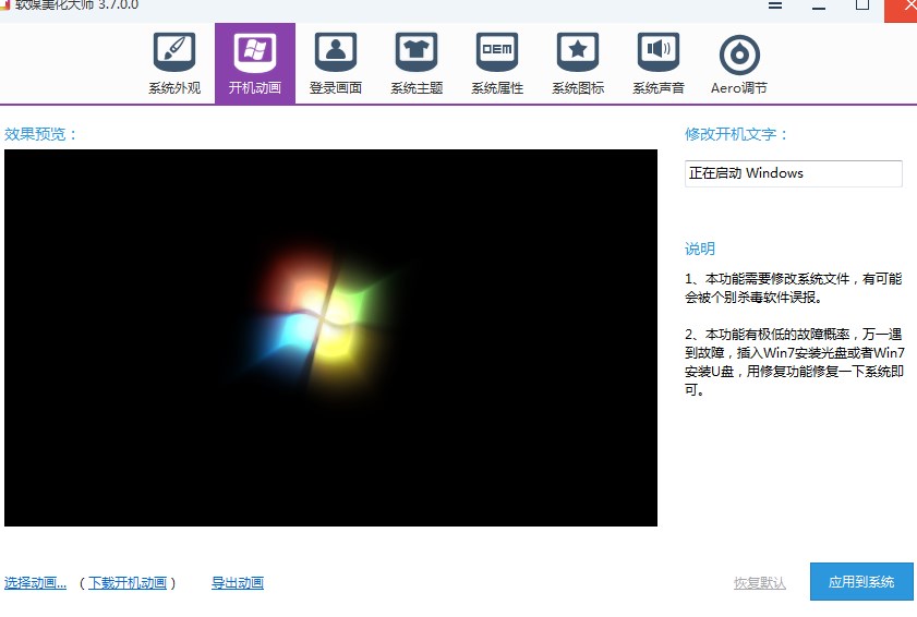 第二步、打開美化大師,選折開機(jī)動(dòng)畫,然后點(diǎn)擊左下角的選折動(dòng)畫,打開自己準(zhǔn)備好的動(dòng)畫,然后點(diǎn)擊應(yīng)用即可