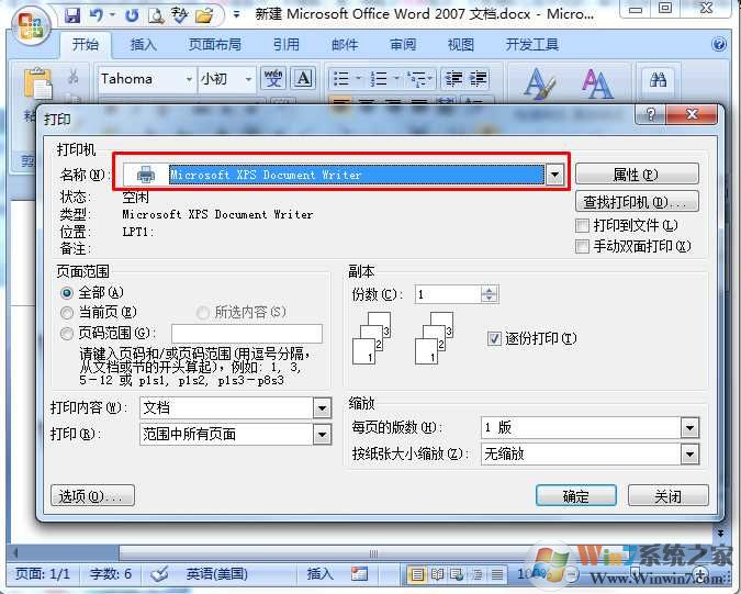 2、然后進行打印~沒錯就是打印,打印機選擇“Microsoft XPS Document Writer”