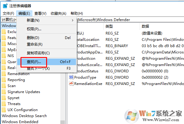 2、在注冊(cè)表編輯器頁(yè)面中點(diǎn)擊編輯選項(xiàng),選擇查找,在查找中輸入需要卸載的軟件即可。