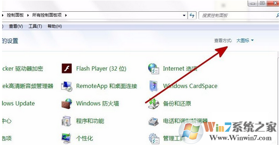 3、控制面板的查看方式選擇“大圖標(biāo)”或“小圖標(biāo)”。