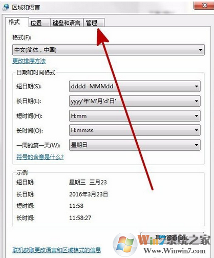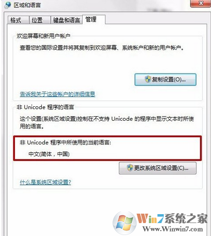 6、切換到“管理”面板,查看非unicode程序語言是否為中文。
