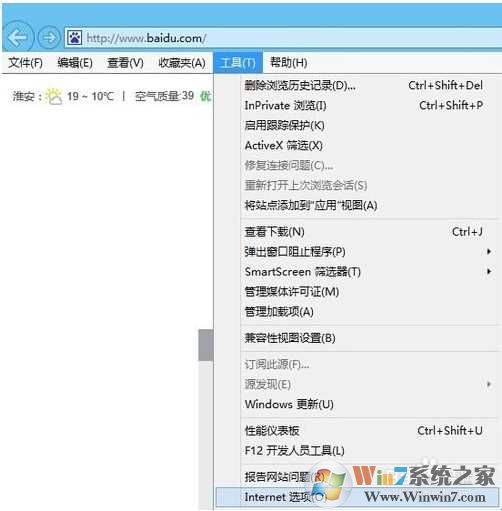 1、打開IE瀏覽器,選擇工具——Internet選項(xiàng)