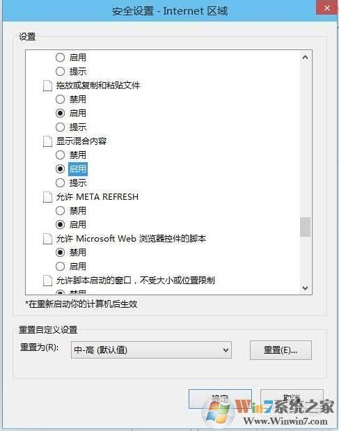 3、最后在安全設(shè)置-internet區(qū)域設(shè)置中的“其他”分類里邊找到“顯示混合內(nèi)容”選“啟用”。