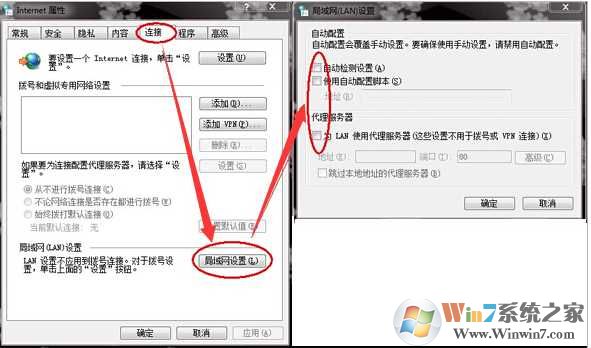 右擊IE圖標(biāo)(或打開IE點擊“工具”、或從控制面板亦可)“Internet選項”→“連接”選項卡→“局域網(wǎng)設(shè)置”→取消勾選這3個復(fù)選框(附圖)