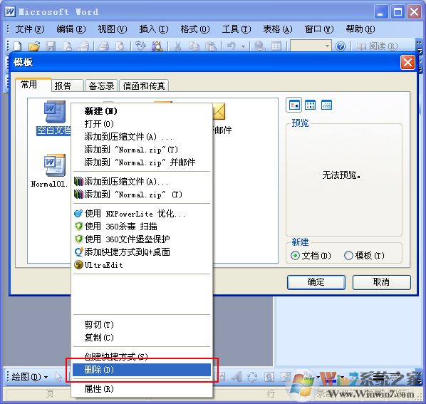 4:在彈出的“模板”窗口中,在默認(rèn)的“常用”選項(xiàng)卡中使用鼠標(biāo)右鍵點(diǎn)擊“空白文檔”,然后在右鍵菜單中選擇“刪除”就可以了。如下圖所示: