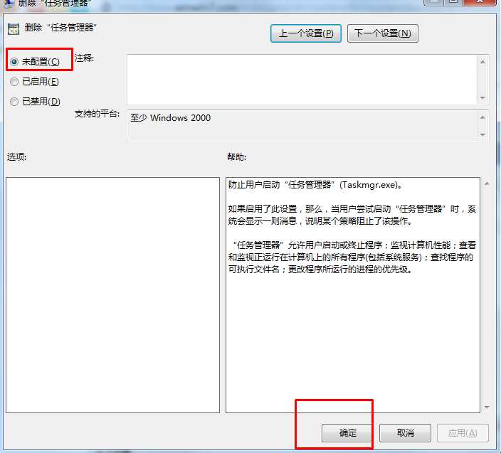 3.在打開(kāi)的刪除“任務(wù)管理器”界面點(diǎn)擊選擇“未配置(E)”點(diǎn)擊確定完成設(shè)置。(之前是已啟用)如下圖所示