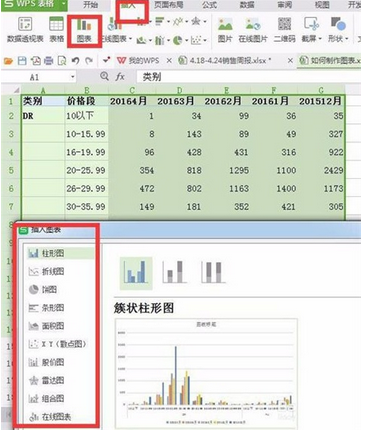 2、如圖在表格上方選插入項,然后在插入項下選中圖表這個項就會出現(xiàn)如圖這樣的一個界面,再選一個我們自己需要的圖形