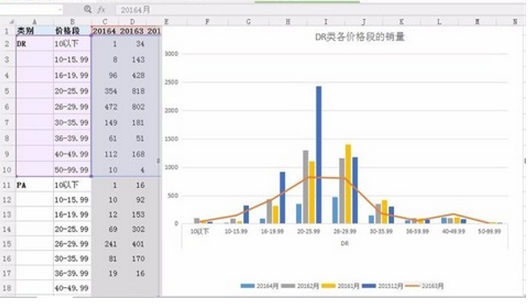 1、首先我們要打開一組我們需要的數(shù)據(jù),此數(shù)據(jù)一定要有一定的分段,否則我們讓它呈現(xiàn)2種圖形就沒有意義了,如圖所示