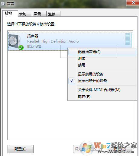 2、此時就彈出一個“聲音”窗口,在選擇設備框里面找到并右擊【揚聲器】,選擇并打開第一項【配置揚聲器】菜單;